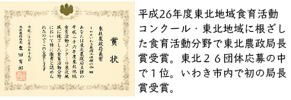 2015年2月には、これまでの取り組みが評価され、東北農政局主催の食育活動コンクールで東北農政局長賞をいただきました。詳しくはこちらへ